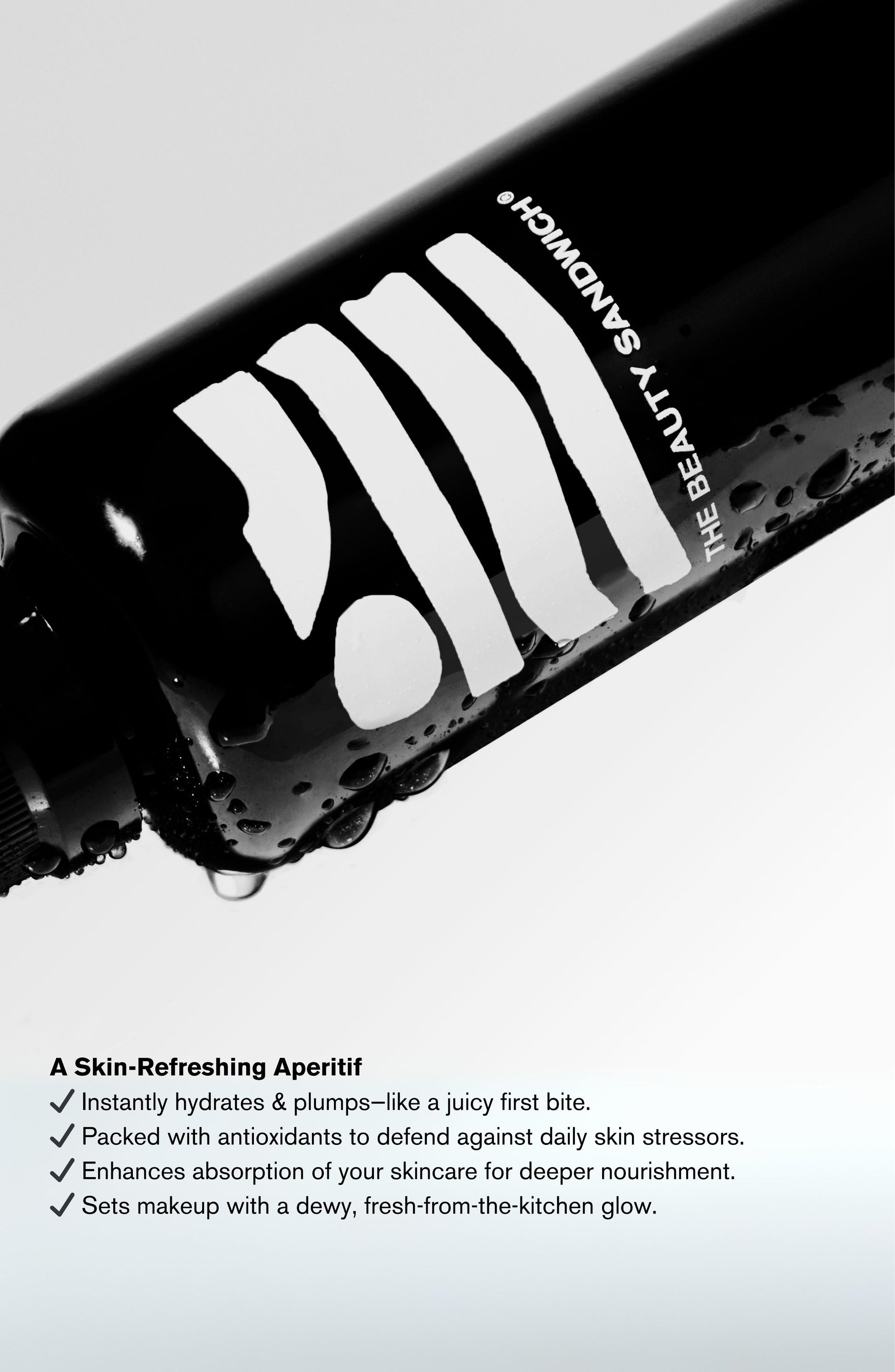 Serve your skin the ultimate appetizer. Our intensely hydrating daily facial mist opens up the appetite of your skin by setting and priming your natural palette and PH levels with harmonious, balanced and natural dewy goodness. This nutrient-rich mist features a host of digestive enzymes, peptides, prebiotics and naturally extracted water that tightens pores, boosts your skin’s natural hyaluronic acid and gives long lasting hydration all day.